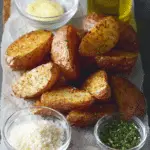 For extra crispy potato wedges, soak the cut potatoes in cold water for 20–30 minutes, then dry thoroughly before seasoning.Russet potatoes work best for a crispy outside and fluffy inside.Add grated parmesan during the last 5 minutes of baking for a cheesy variation.For a spicy version, add chili powder or cayenne pepper.Air fryer method: Cook at 200°C (400°F) for 20–25 minutes, shaking halfway through.