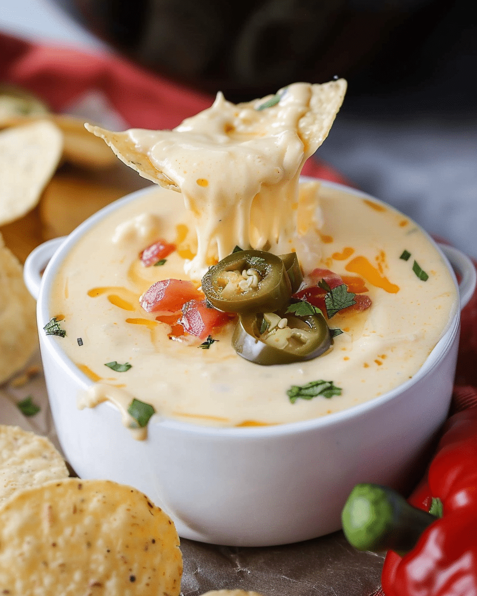 Store leftover queso dip in an airtight container in the refrigerator for up to 4 days. To reheat, microwave in 30-second intervals, stirring each time until smooth. Alternatively, reheat in the crock pot on low, stirring occasionally until warmed through. If the dip thickens too much, stir in a splash of milk to loosen it up.