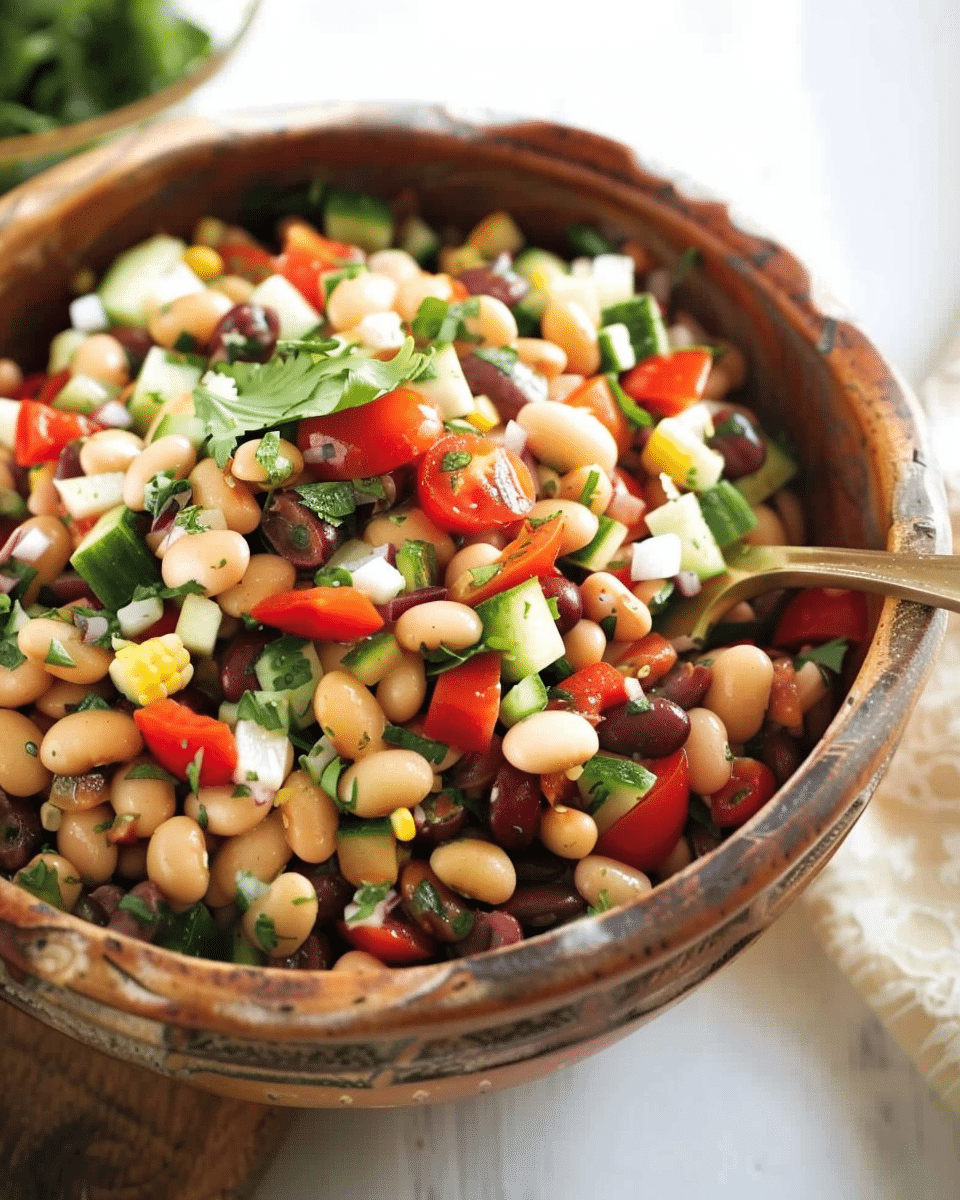 Use any combination of beans you prefer or have on hand.Salad gets more flavorful after a few hours or overnight in the fridge.Add grains like quinoa or farro for more bulk.For a Mediterranean twist, add olives, cucumber, and cherry tomatoes.Best served chilled or at room temperature.