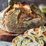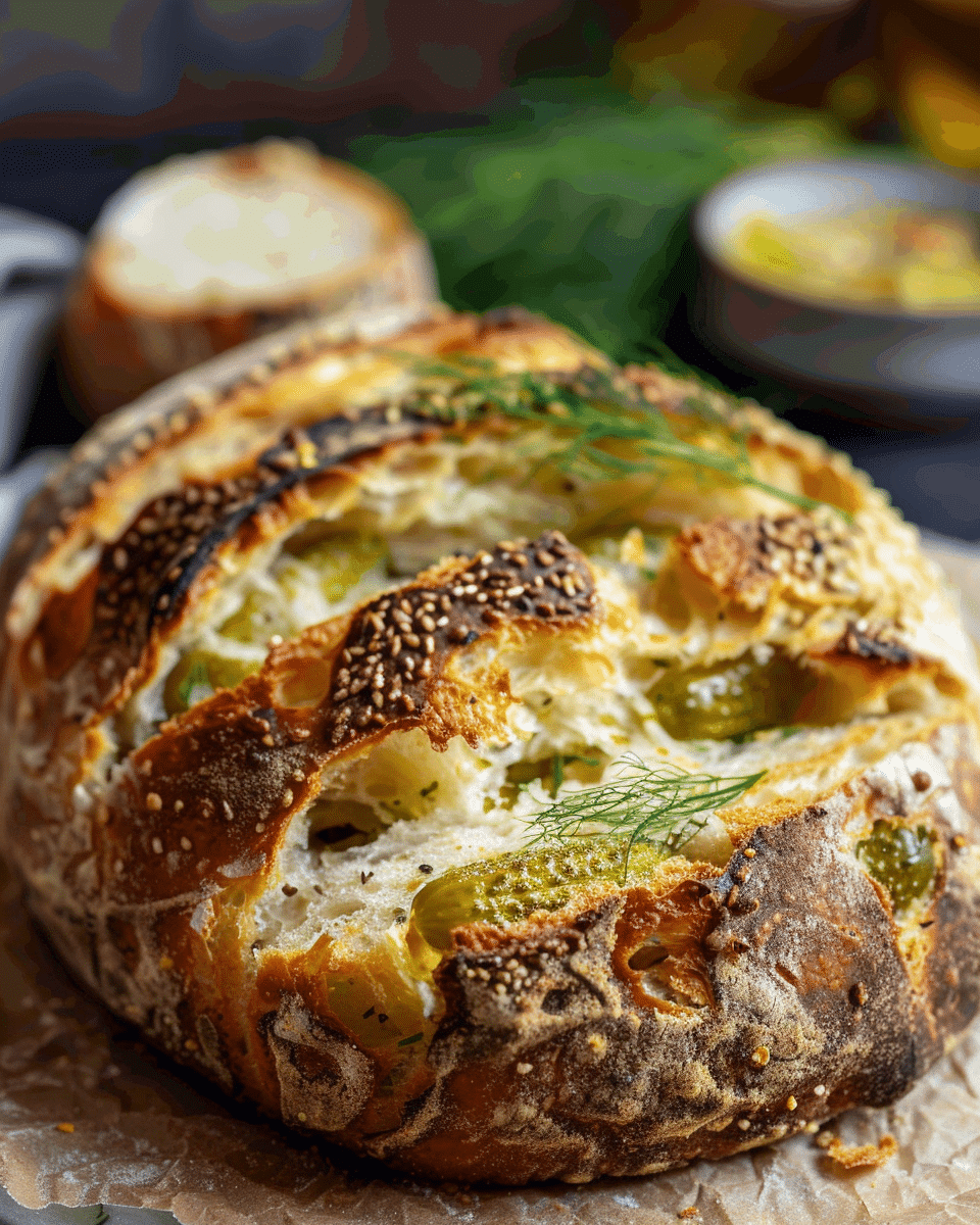 Dill Pickle Sourdough Bread is a tangy, chewy artisan loaf made with chopped dill pickles, fresh dill, and pickle juice for a bold, briny twist on classic sourdough. Perfect for sandwiches, toast, or snacking straight from the loaf.