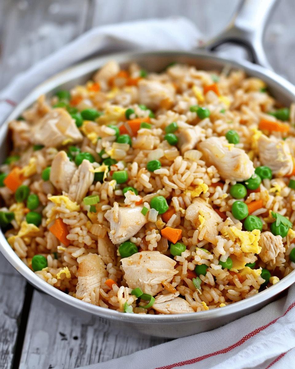 Use day-old rice for best texture.Swap chicken with shrimp, beef, or tofu for variation.Add extra veggies like broccoli, bell peppers, or corn.Make it spicy with chili flakes, hot sauce, or fresh chilies.Freeze leftovers for up to 2 months; reheat on stovetop or microwave.