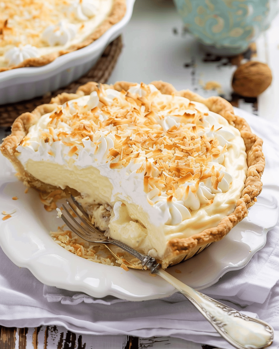 Easy Coconut Cream Pie is a smooth, creamy dessert with a luscious coconut custard filling inside a flaky crust, topped with fluffy whipped cream and toasted coconut. It’s rich yet light, simple to make, and bursting with tropical flavor.