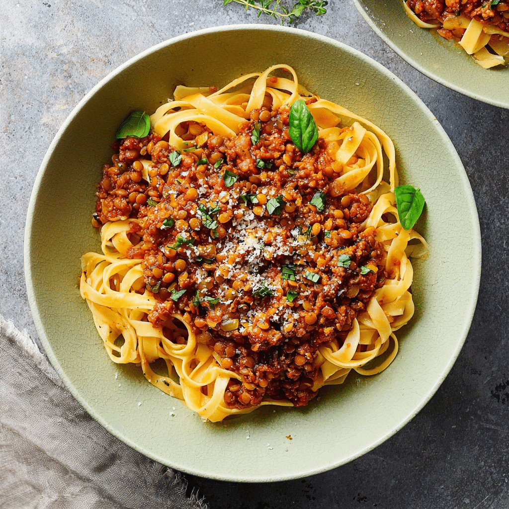 Serve the lentil Bolognese over cooked pasta. Garnish with fresh herbs and grated Parmesan if desired.