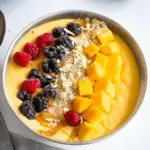 This Easy Mango Smoothie Bowl is a thick, creamy, and refreshing tropical breakfast made by blending frozen mango with banana and plant-based milk. Topped with fruit, seeds, and granola, it’s a vibrant and nourishing treat ready in minutes.