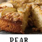 Toss pear pieces in a little flour before adding to batter to prevent sinking.Use firm, ripe pears like Bartlett, Bosc, or Anjou for best texture.Yogurt adds extra moisture and a tender crumb—great alternative to milk.Add chopped walnuts or pecans for crunch and flavor.Cake can be made ahead—it tastes even better the next day.