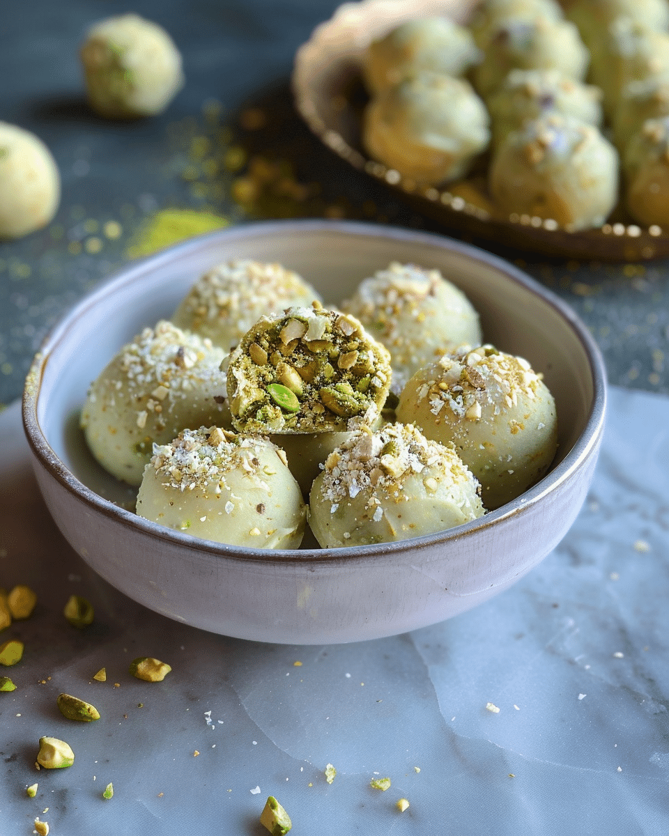 Coconut pistachio: Roll the balls in shredded coconut for added texture and flavor.