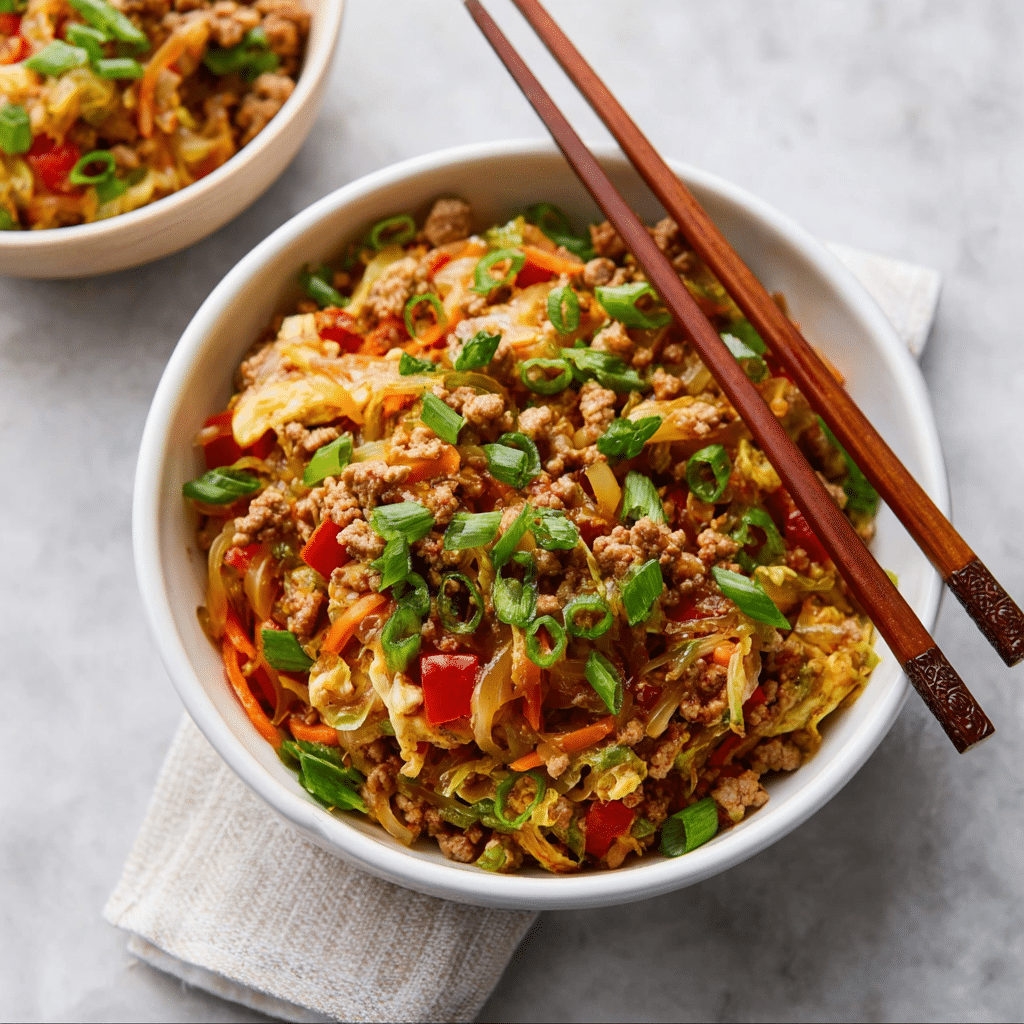 Egg Roll In A Bowl is a healthy, low-carb twist on the classic egg roll, served without the wrapper. This one-pan dish is packed with savory meat, cabbage, and flavorful seasonings for a quick and satisfying meal.