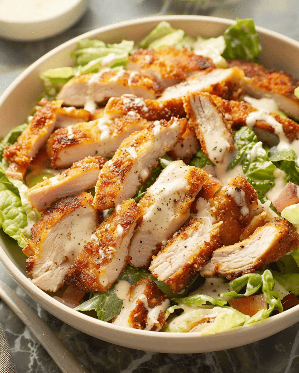 EXTRA Crispy Chicken Caesar Salad takes the classic Caesar salad to new heights with golden, ultra-crispy chicken, creamy Caesar dressing, and crunchy croutons. This hearty, flavorful salad is perfect for lunch or dinner, delivering all the comfort of a traditional Caesar with a crispy chicken twist. Quick to prepare and customizable, this dish is perfect for any occasion!