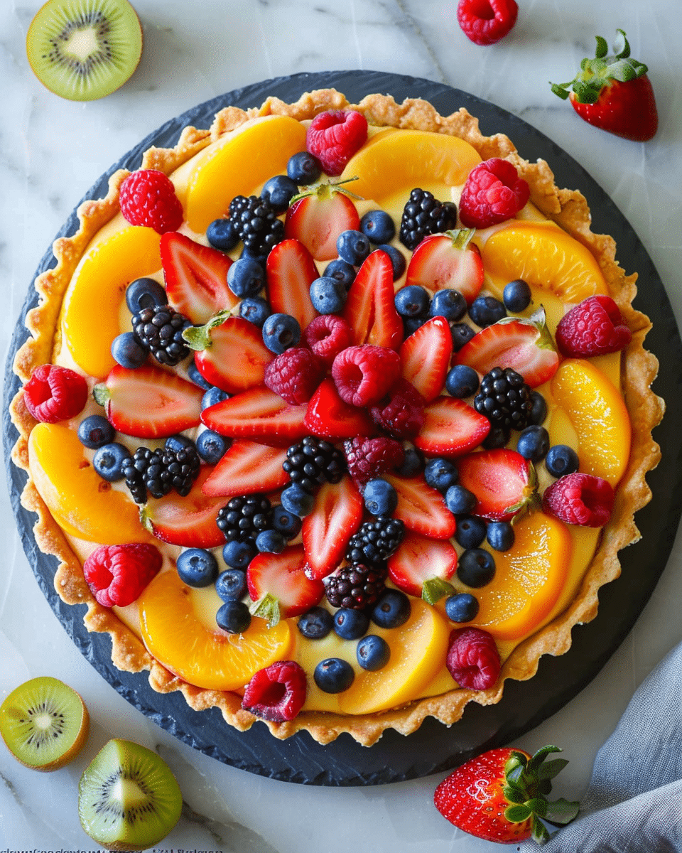Crust Variations: Swap the shortcrust pastry for a gluten-free option or graham cracker crust.Fruit Combinations: Customize with your favorite fruits, such as peaches, pears, or pomegranate seeds.Lemon Custard: Add lemon zest and use part lemon juice in the custard for a citrus twist.Chocolate Layer: Add a thin layer of melted chocolate beneath the custard for extra flavor.