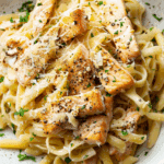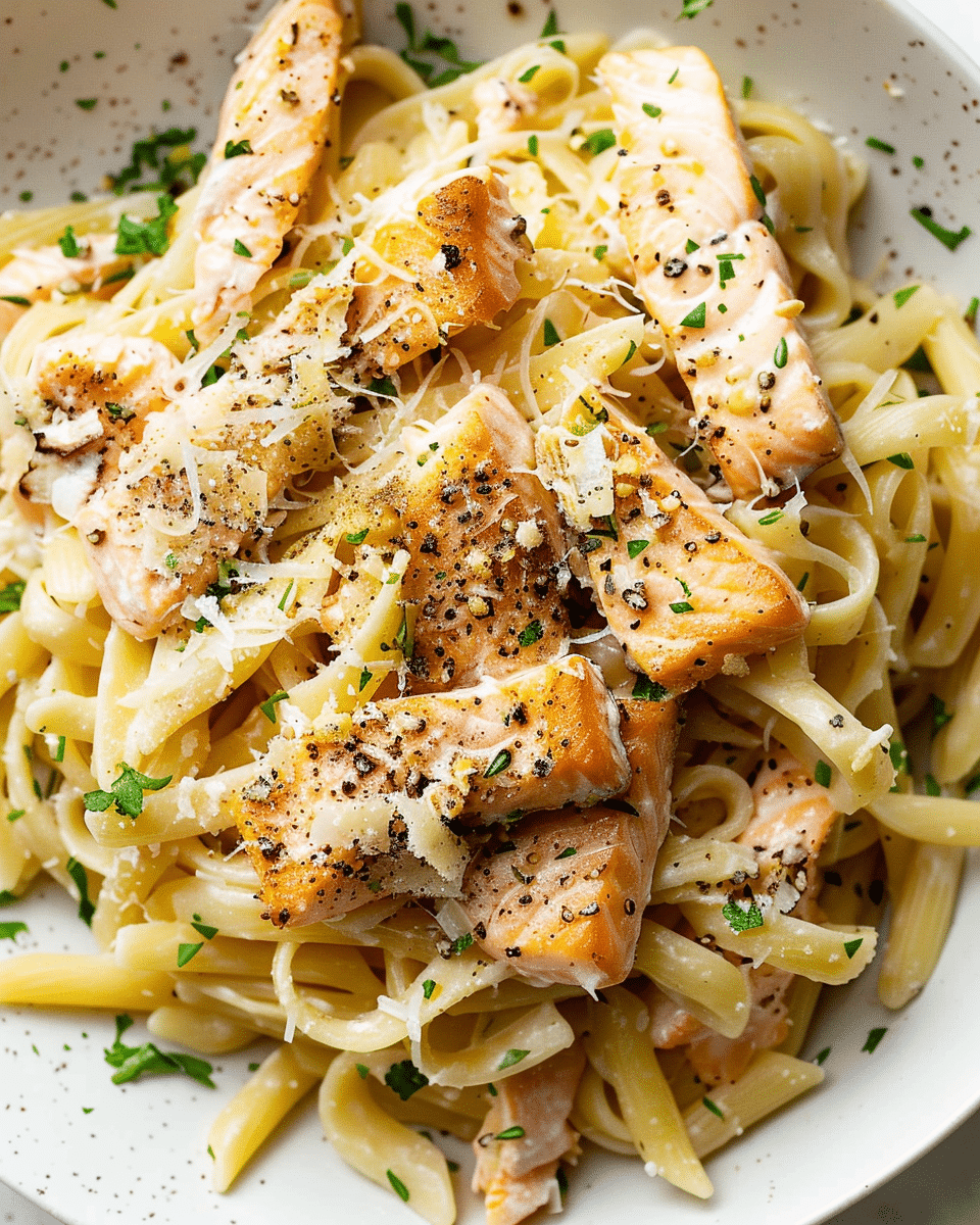 A rich and comforting pasta dish featuring tender salmon, a buttery garlic sauce, and fresh herbs. Ready in under 30 minutes, it’s perfect for both weeknight dinners and special occasions.