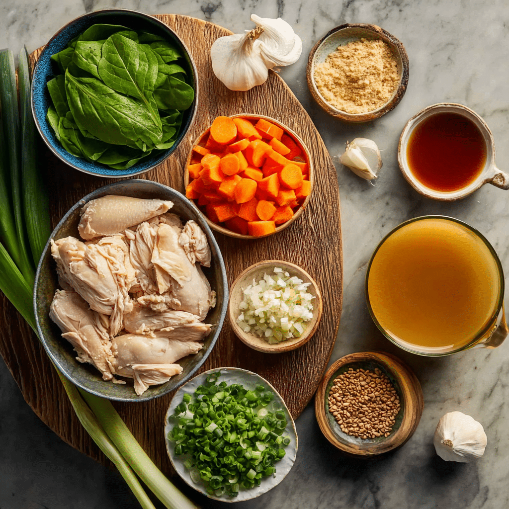 (Tip: You’ll find the full list of ingredients and measurements in the recipe card below.) chicken breast or thighs garlic fresh ginger olive oil or sesame oil miso paste (white or yellow) chicken broth soy sauce carrots green onions mushrooms spinach or bok choy noodles or rice (optional) salt black pepper chili flakes (optional)