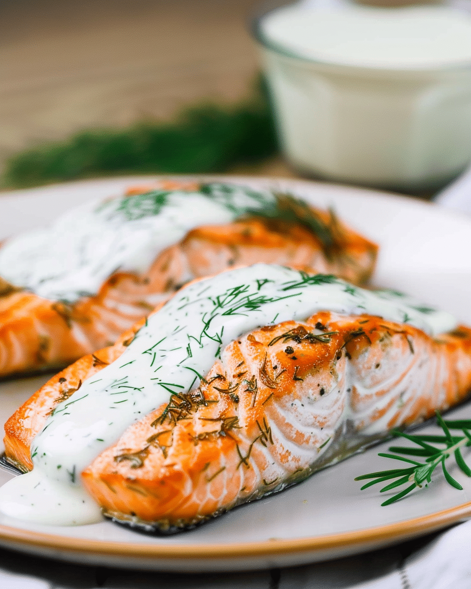 Use fresh rosemary for the best flavor; substitute dried rosemary if needed.Make the dill sauce ahead of time for deeper flavor.Serve the sauce cold or at room temperature for contrast with the warm salmon.Customize the sauce with add-ins like capers or cucumber for extra texture.This recipe works well with trout, halibut, or cod if salmon is unavailable.