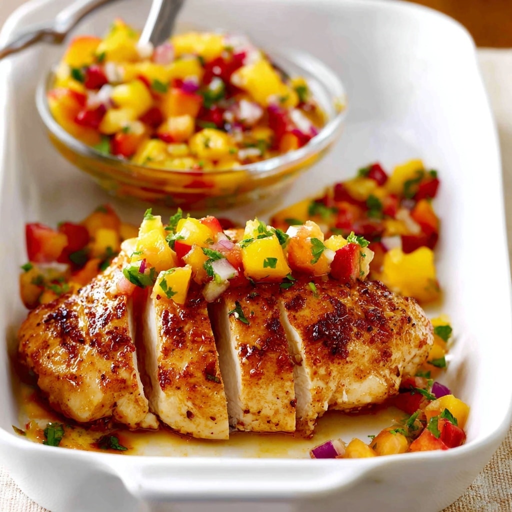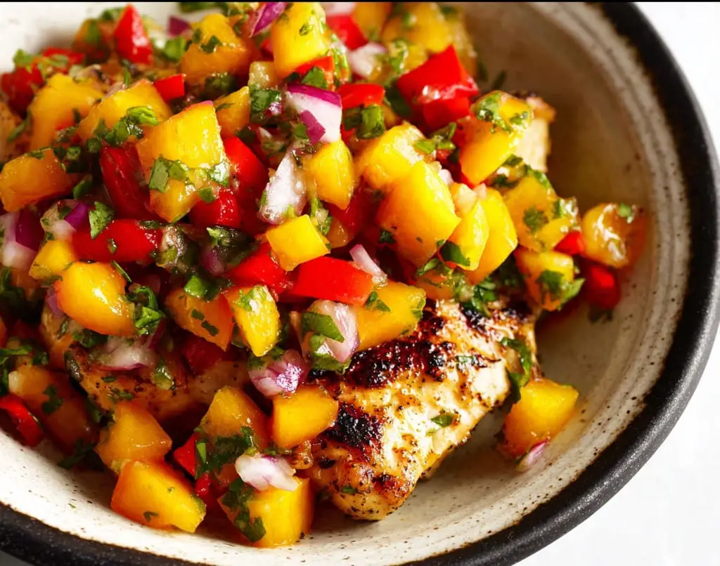 Use tamari instead of soy sauce for a gluten-free option.Peach salsa is best fresh—stir before serving if made ahead.For a tropical twist, substitute or combine peaches with mango.To make a full meal, serve over rice or quinoa.Chicken can also be baked at 400°F (200°C) for 20–25 minutes.