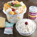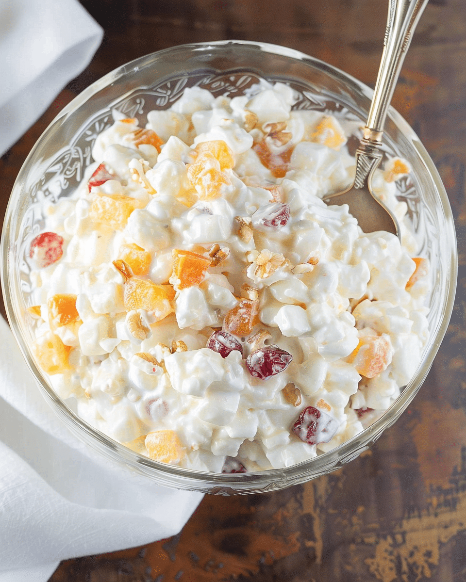 It’s a creamy fruit salad traditionally made with canned fruit, marshmallows, coconut, and a whipped dressing.
