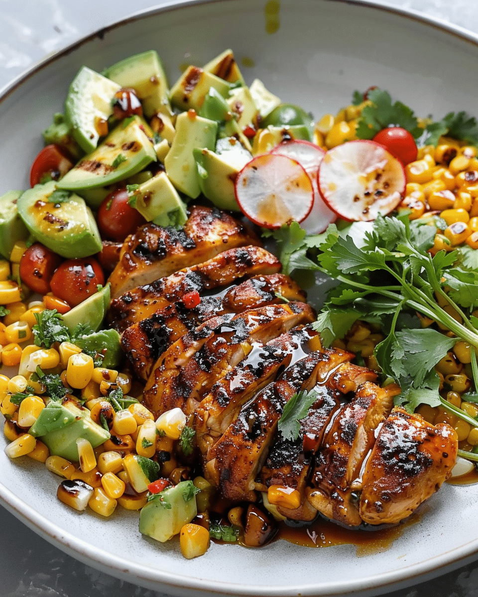 Grilled Hot Honey Chicken with Sweet Corn Salad is a flavorful, smoky dish featuring tender chicken glazed with a sweet and spicy hot honey sauce, paired with a tangy, fresh corn salad. Perfect for summer barbecues, weeknight dinners, or dinner parties, this dish combines the bold flavors of grilled chicken and crisp corn salad for a satisfying, well-rounded meal. Easy to make and customizable, this recipe will impress guests and become a family favorite.