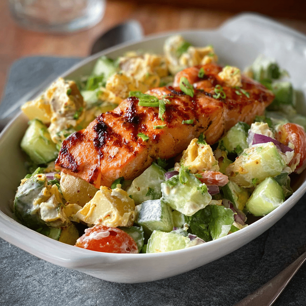 Grilled Salmon and Potato Salad is a fresh and satisfying dish combining smoky, tender salmon with a creamy, herb-infused potato salad. This easy grilled salmon and potato salad recipe is perfect for light dinners, summer meals, or entertaining, offering a delicious balance of rich, tangy, and fresh flavors.