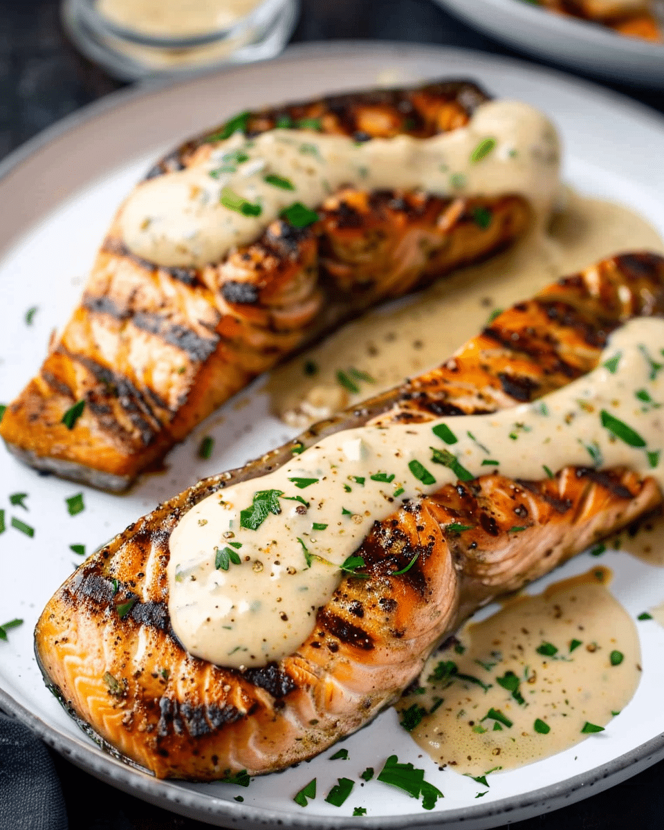Use salmon fillets if steaks aren’t available—adjust cooking time.Add a teaspoon of honey for a sweet honey mustard variation.Use Greek yogurt or coconut cream instead of heavy cream for dietary preferences.Make the sauce ahead and reheat gently to avoid curdling.Grill pan works well if outdoor grill is unavailable.