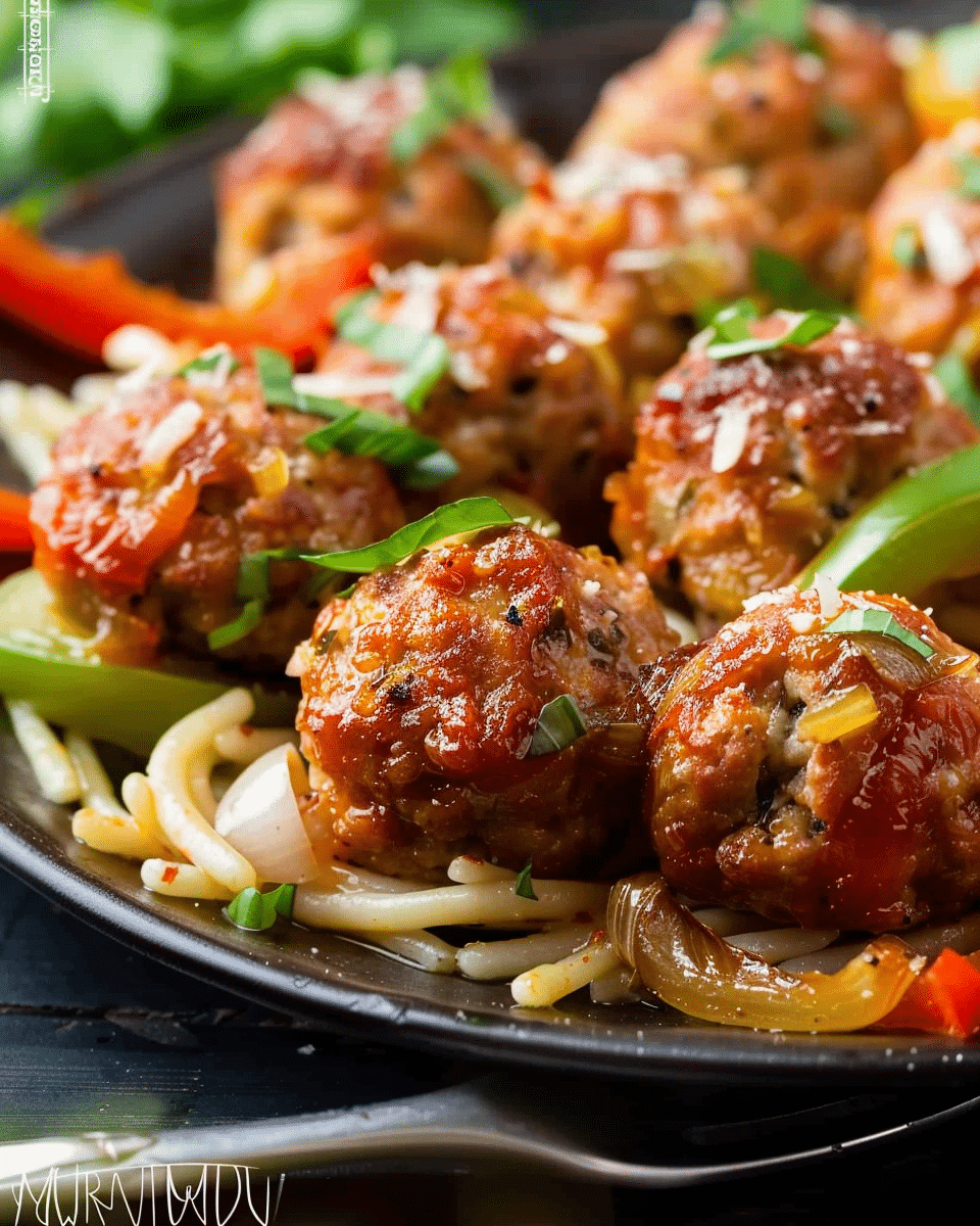 Juicy ground chicken meatballs paired with tender sautéed peppers and onions for a colorful, flavorful, and protein-rich dish perfect for weeknight dinners or meal prep.