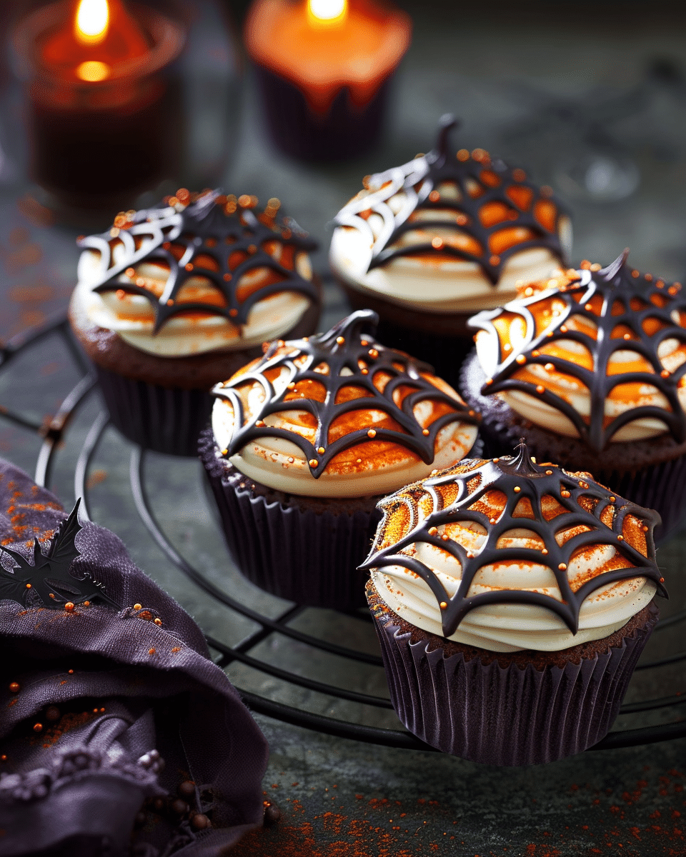 Spiderweb cupcakes: Pipe a white web on black or dark-colored frosting using a toothpick and piping bag.