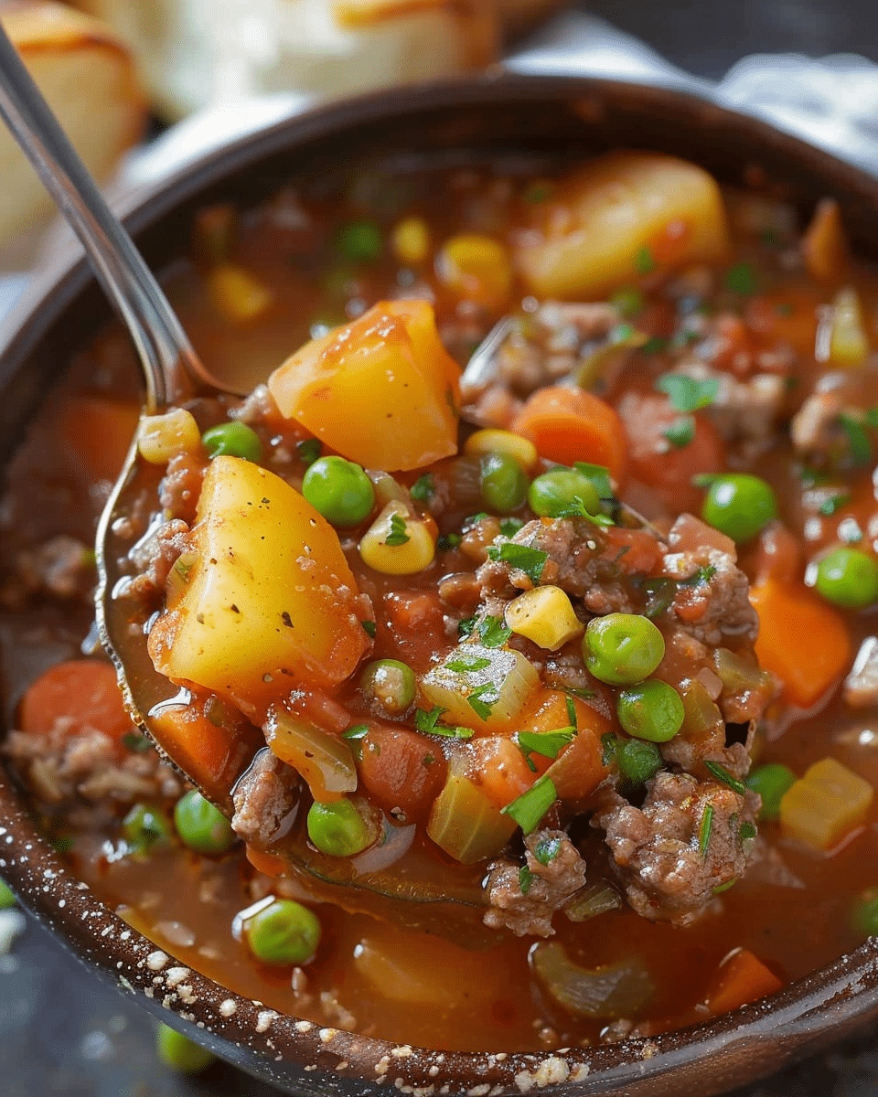 Hamburger Stew is a comforting, hearty dish made with savory ground beef, tender vegetables, and a flavorful broth. This easy-to-make, one-pot meal is perfect for chilly days and customizable with any vegetables or seasonings you have on hand. Serve it with crusty bread or crackers for a filling, satisfying dinner.