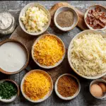 (Tip: You’ll find the full list of ingredients and measurements in the recipe card below.) frozen hashbrowns, thawed cheddar cheese sour cream cream of chicken soup butter onion garlic powder salt black pepper