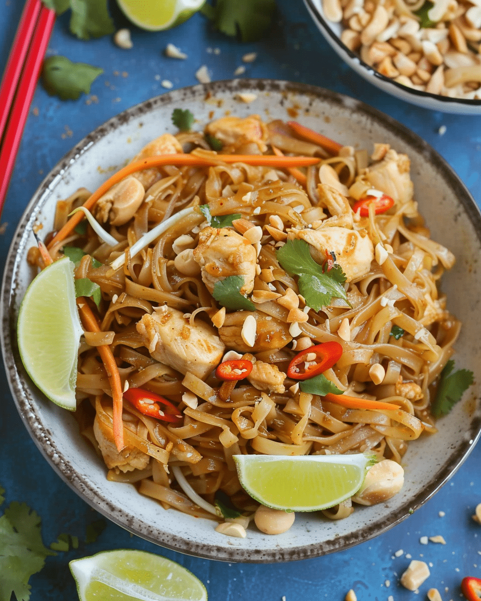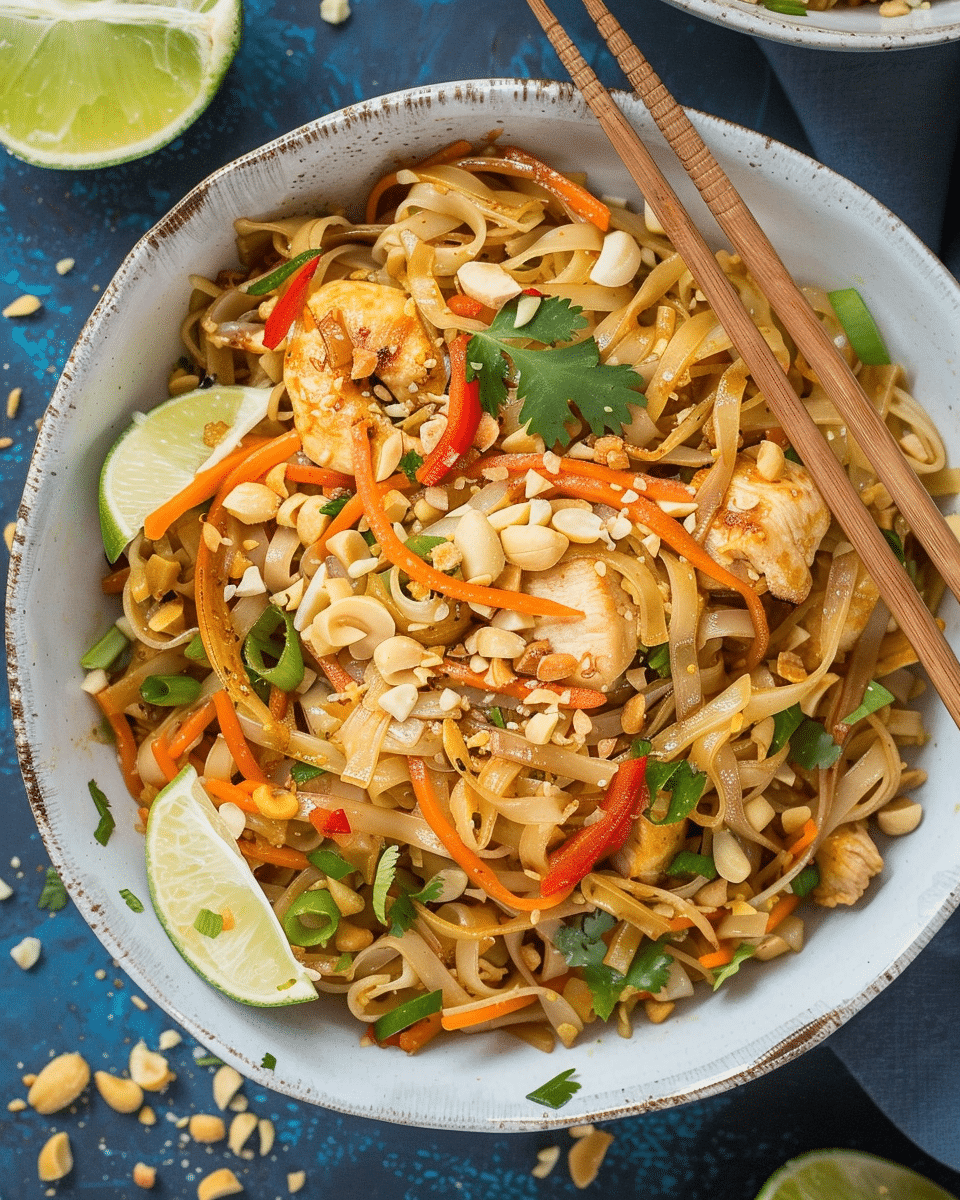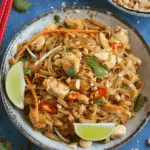 Healthy Chicken Pad Thai is a lighter, homemade version of the Thai takeout classic. With tender chicken, rice noodles, fresh vegetables, and a naturally sweetened tangy sauce, it’s a nutritious and satisfying 30-minute meal.