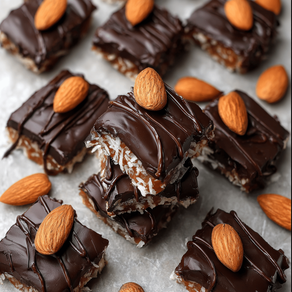 These bars are a healthier twist on a classic candy, made with simple plant-based ingredients and no refined sugars. They’re easy to prepare, require no baking, and offer a perfect balance of chewy coconut, crunchy almonds, and smooth chocolate. Great for snacks, desserts, or meal prep treats.
