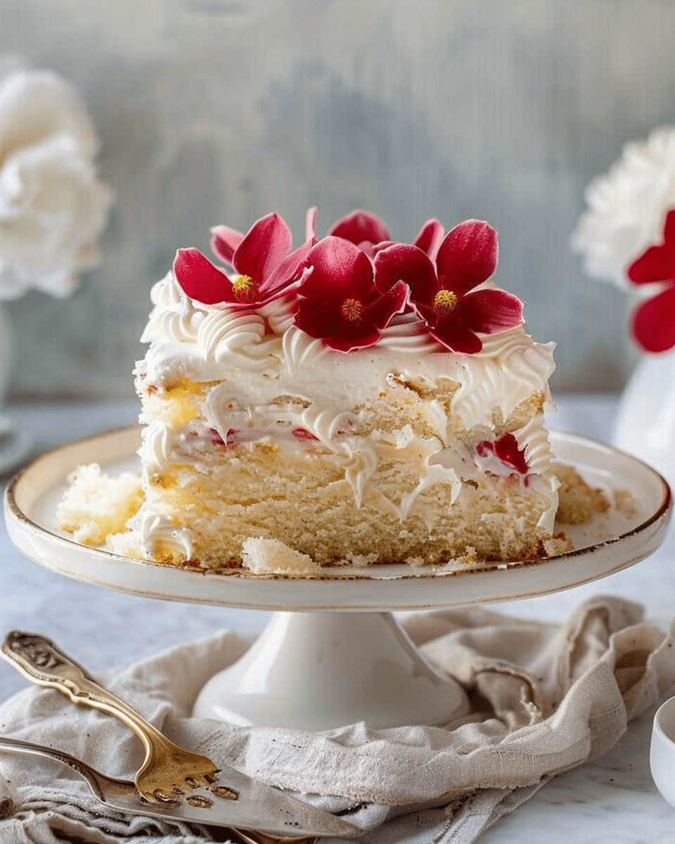 Before serving, garnish the top of the cake with shredded coconut and chopped nuts, if desired, for an extra touch of texture and flavor.