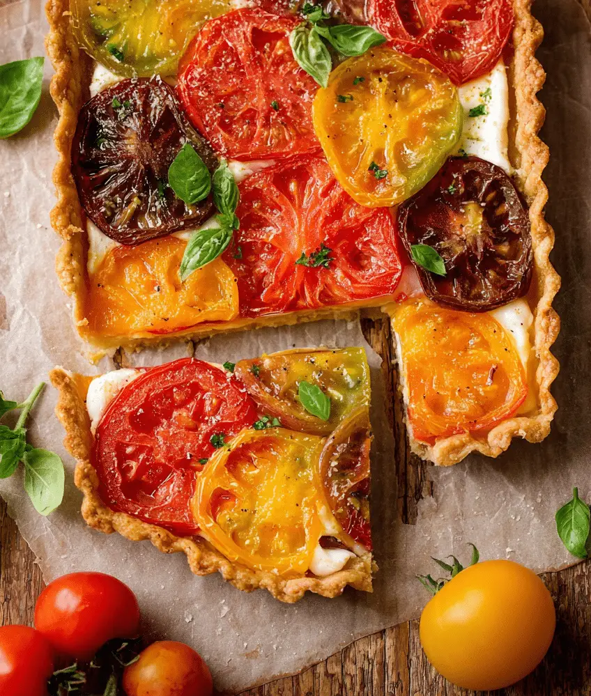 Heirloom tomato tart is a colorful, savory dish featuring juicy heirloom tomatoes layered over a creamy cheese filling on a crisp, buttery crust. It’s elegant yet simple, perfect for light meals, entertaining, or showcasing seasonal tomatoes.