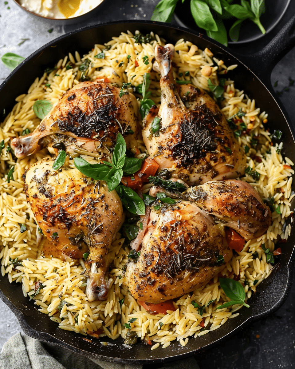 You can add vegetables such as cherry tomatoes, spinach, or zucchini to the orzo for extra color and nutrition. Swap fresh herbs for dried if needed, or add paprika or chili flakes for a warmer flavor profile. Bone-in chicken thighs can also be used instead of a whole chicken.