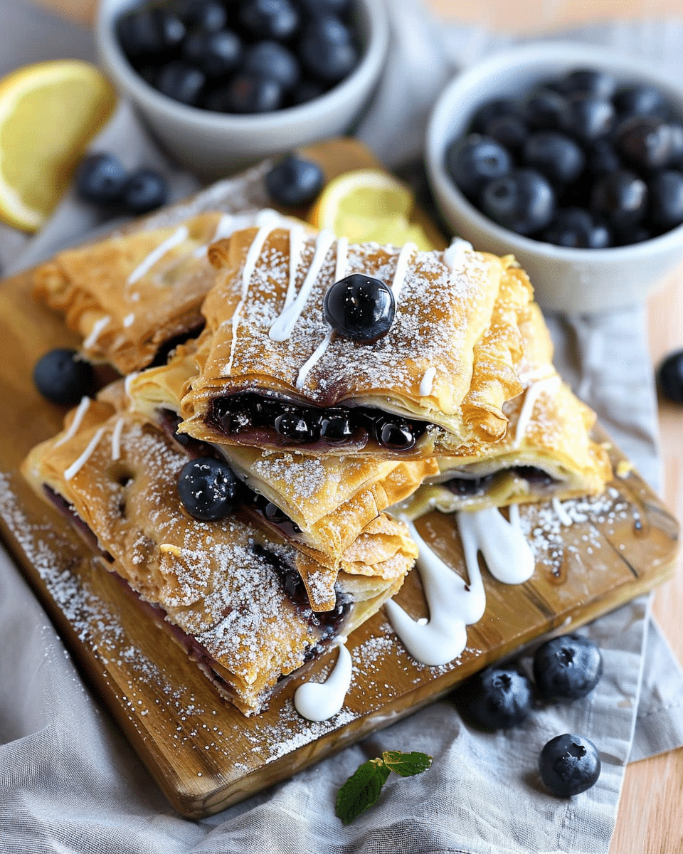 Use frozen blueberries straight from the freezer—no need to thaw.Don’t overfill to avoid leaking during baking.Pipe the glaze in classic squiggle style for a nostalgic touch.For added richness, spread sweetened cream cheese under the fruit filling.Freeze assembled, unbaked strudels for future baking—add a few minutes to bake time.
