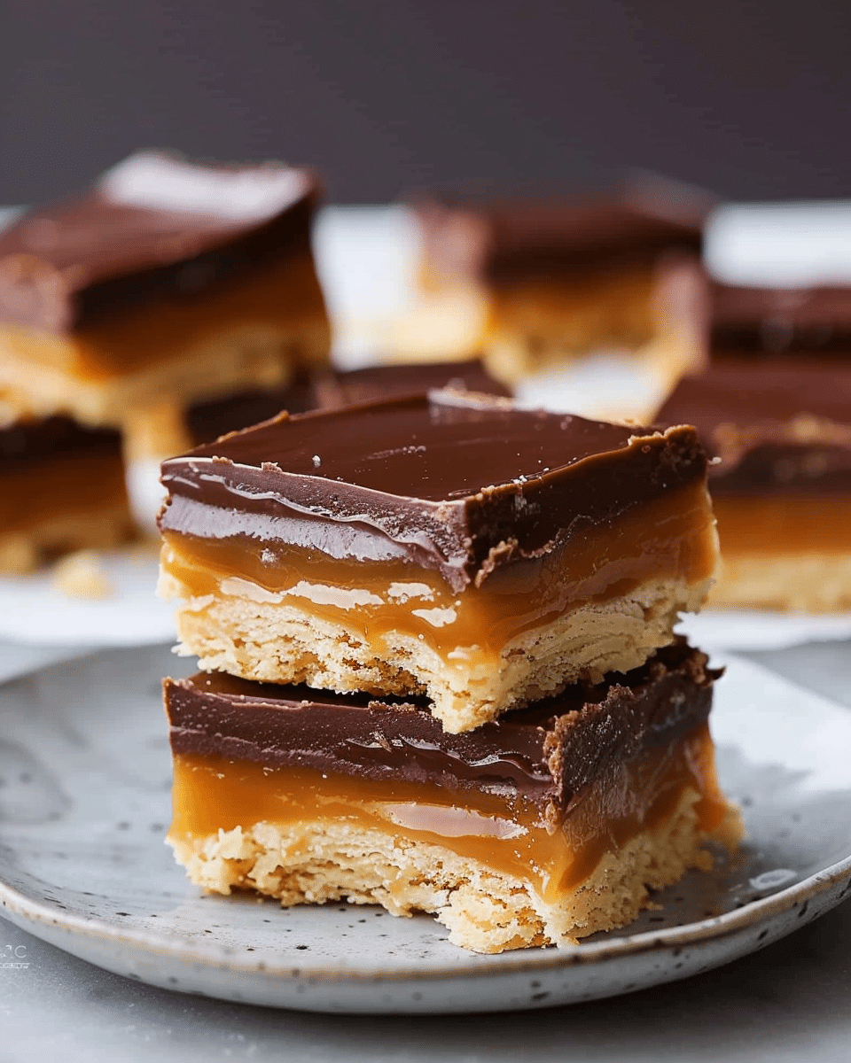 Use dark chocolate for a less sweet version.Sprinkle sea salt on the chocolate for salted caramel flavor.For a twist, stir peanut butter into the caramel layer.Use gluten-free flour to make the recipe gluten-free.Freeze for up to 2 months with parchment between layers.