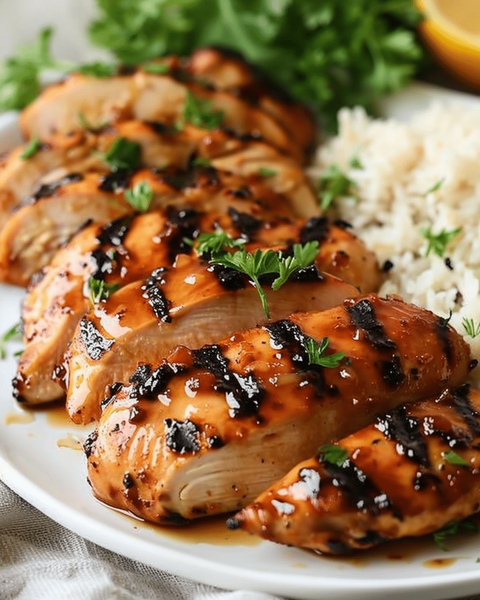 For a spicy kick, add red pepper flakes, cayenne pepper, or a finely chopped jalapeño to the marinade.For bone-in chicken, you can use thighs or drumsticks, but increase the grilling time to ensure they cook through.If you prefer baking, place the marinated chicken on a baking sheet and bake at 375°F (190°C) for 25-30 minutes, or until the internal temperature reaches 165°F (74°C).Storage: Leftover grilled chicken can be stored in an airtight container in the refrigerator for up to 3 days.Reheating: Reheat the chicken in the microwave, on the stovetop, or in the oven at 350°F (175°C) for about 10 minutes.