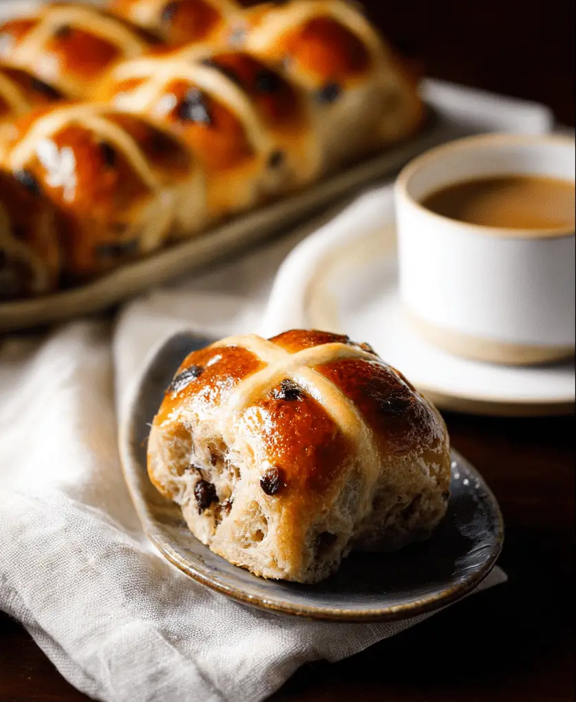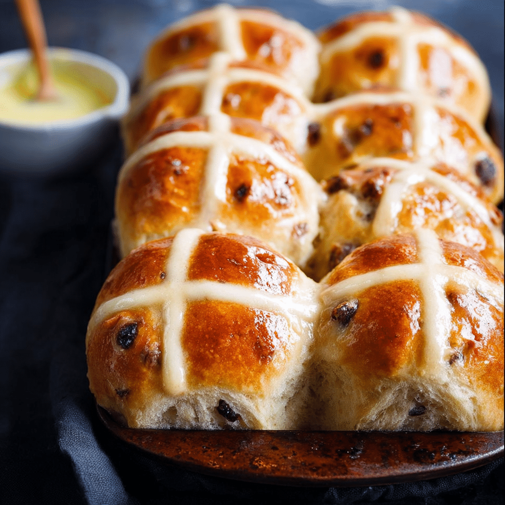 Hot cross buns are soft, lightly spiced sweet rolls studded with dried fruit and topped with their signature cross. Warm, fluffy, and comforting, they’re perfect enjoyed fresh with butter.