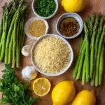 (Tip: You’ll find the full list of ingredients and measurements in the recipe card below.) orzo pasta fresh asparagus garlic cloves lemon juice lemon zest olive oil vegetable broth salt black pepper nutritional yeast (optional) fresh parsley red pepper flakes (optional)
