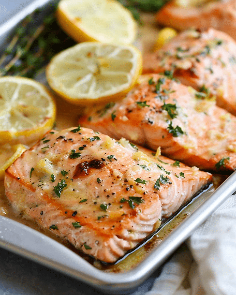 Use skin-on salmon for extra moisture and flavor.Don’t overbake—salmon is done when it flakes easily with a fork.Add vegetables to the baking dish for a complete one-pan meal.Leftover lemon butter sauce can be spooned over rice or vegetables.This recipe is naturally gluten-free and rich in omega-3 fatty acids.