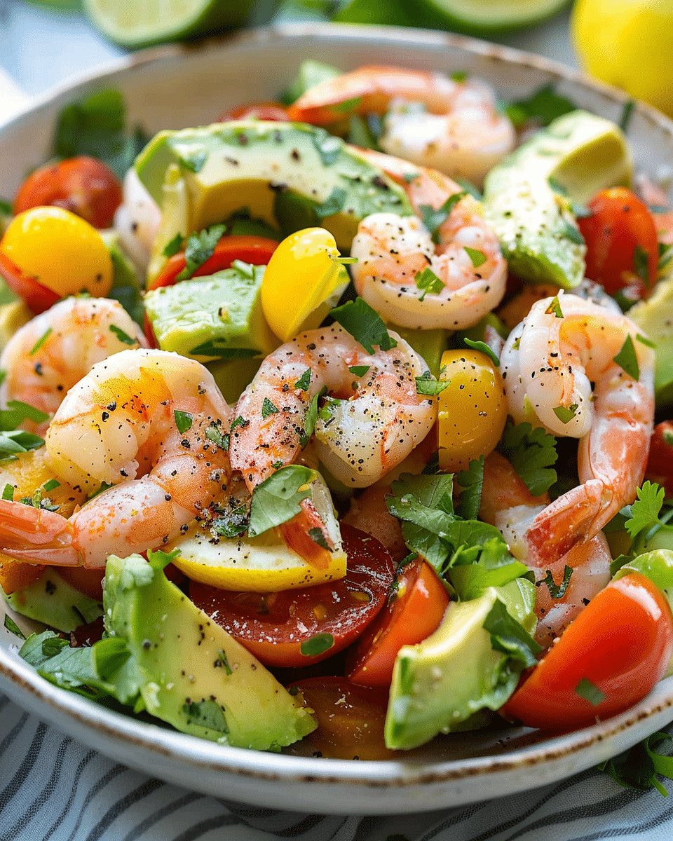This Lemony Shrimp Avocado Tomato Salad is bursting with fresh flavors and textures. The succulent shrimp are lightly seasoned and paired with creamy avocado and ripe tomatoes, creating a perfect balance of savory, creamy, and tangy. The lemon dressing brings everything together with a zesty punch that adds brightness to the dish. It’s quick to make, healthy, and incredibly satisfying—ideal for a nutritious lunch or a light dinner.