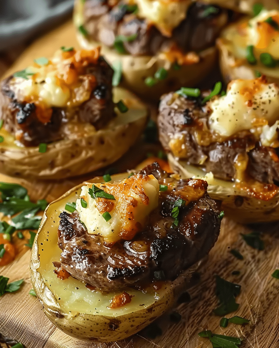 Loaded Baked Potatoes with Garlic Butter Steak Bites is the ultimate comfort food, featuring creamy baked potatoes topped with savory garlic butter steak bites, melted cheese, and fresh green onions. A filling, flavorful dish perfect for dinner or impressing guests!