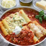 Manicotti is a hearty Italian-American dish made with large pasta tubes stuffed with a creamy ricotta cheese filling, smothered in marinara sauce, and baked to cheesy perfection. It’s a comforting, crowd-pleasing favorite for any occasion.