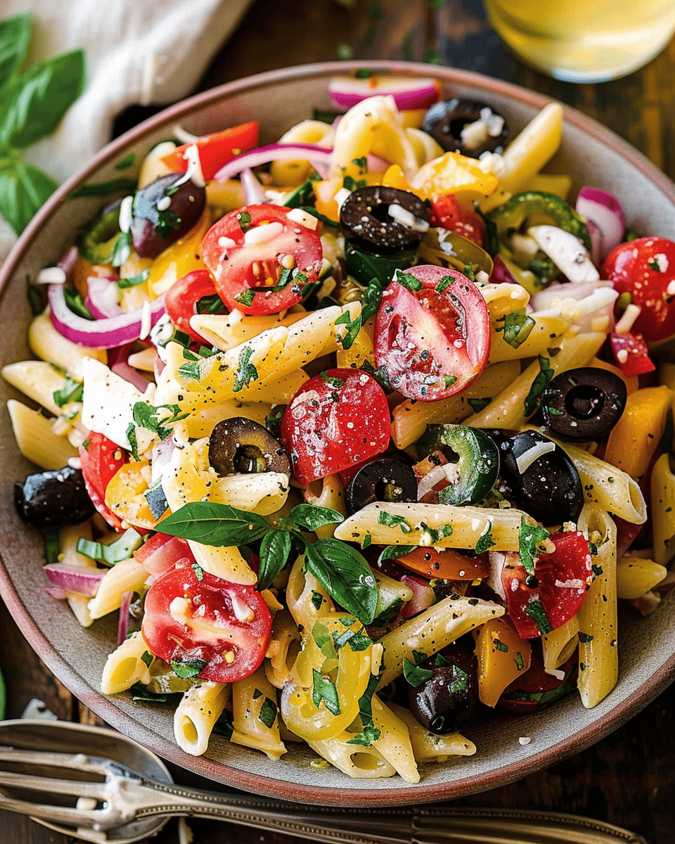Med Pasta Salad is a vibrant Mediterranean-inspired pasta salad featuring al dente pasta, fresh veggies, kalamata olives, sun-dried tomatoes, and crumbled feta tossed in a zesty olive oil dressing. It’s a light, flavorful dish perfect for any occasion.