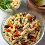 Store Mediterranean pasta salad in an airtight container in the refrigerator for up to 4 days. It’s best served cold or at room temperature, so no reheating is needed. If the pasta dries out slightly, revive it with a drizzle of olive oil before serving.