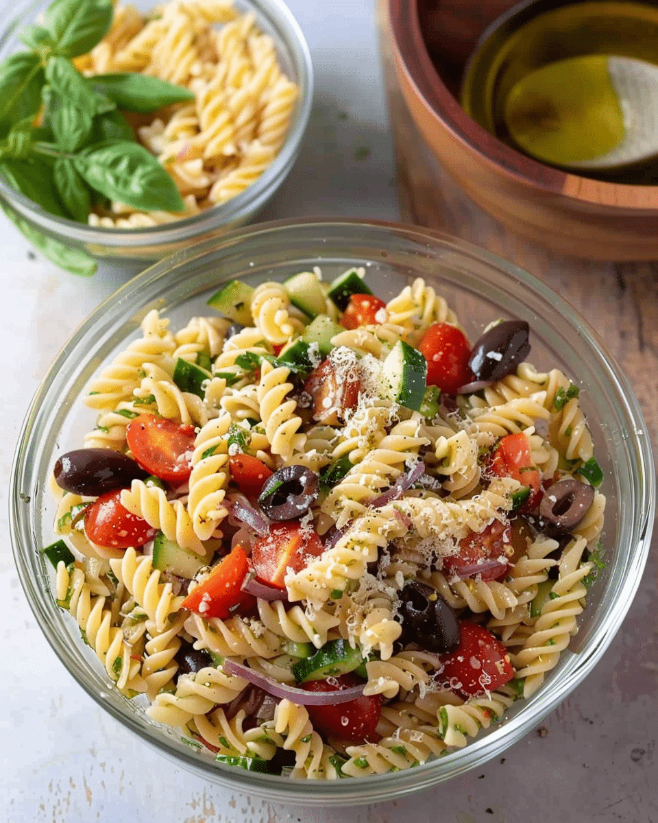 This Mediterranean pasta salad is light yet satisfying, packed with bold flavors from ingredients like olives, sun-dried tomatoes, and tangy feta. It’s a perfect make-ahead dish that tastes even better after sitting, making it ideal for meal prep or gatherings. Quick to prepare, endlessly customizable, and suitable for all seasons, it brings a fresh Mediterranean flair to your table.