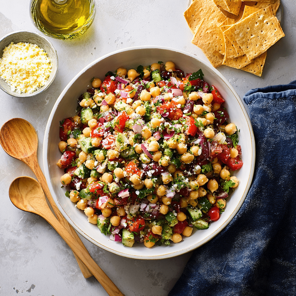 Use canned chickpeas for convenience or cook dried chickpeas from scratch.Omit feta for a vegan version.Add fresh herbs like mint or dill for extra flavor.Best served cold or at room temperature.Store in the fridge for up to 4 days.