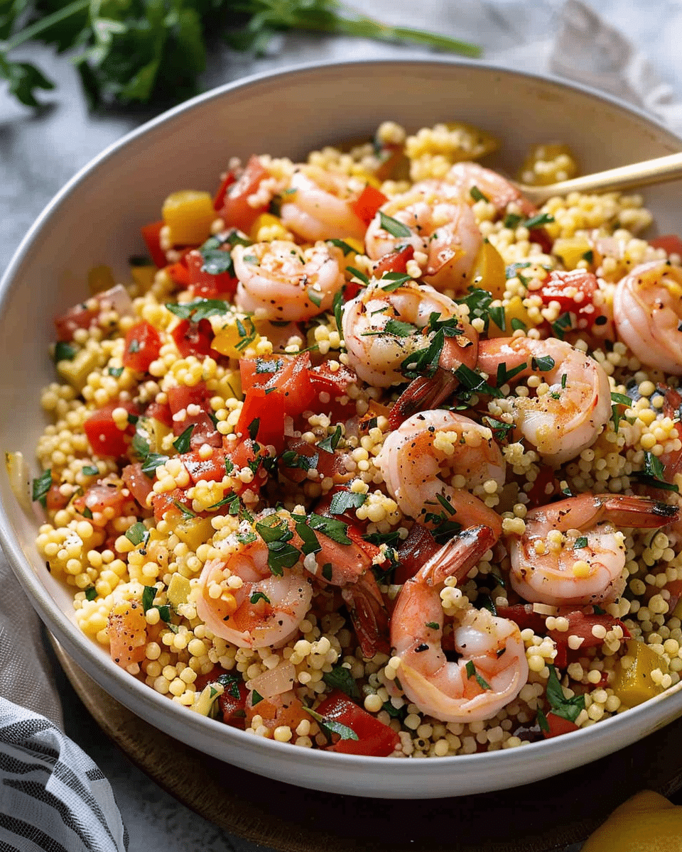 Use pearl couscous for a chewier texture or regular for a lighter feel.Customize with added veggies like bell peppers or spinach.Make it vegetarian by omitting shrimp and adding chickpeas.Best served chilled or at room temperature.Fresh lemon juice gives the best flavor, but bottled works in a pinch.