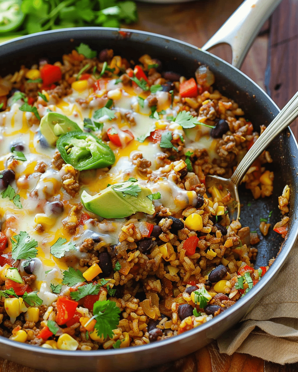 • Spicy Kick: Add diced jalapeños or a splash of hot sauce to the skillet for extra heat. • Vegetarian Version: Substitute the ground beef with plant‑based crumbles or extra beans. • Cheesy Fiesta: Stir in pepper jack cheese instead of cheddar for a bolder flavor. • Mexican Street Corn Style: Add crema and a squeeze of lime with a sprinkle of cotija cheese at the end. • Rice Swap: Use cauliflower rice for a low‑carb version—adjust cook time accordingly.