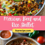 Mexican Beef and Rice Skillet is a flavorful one-pan meal made with seasoned ground beef, rice, beans, vegetables, and salsa. It’s a quick and hearty dinner that’s easy to make and packed with bold, Mexican-inspired flavors.