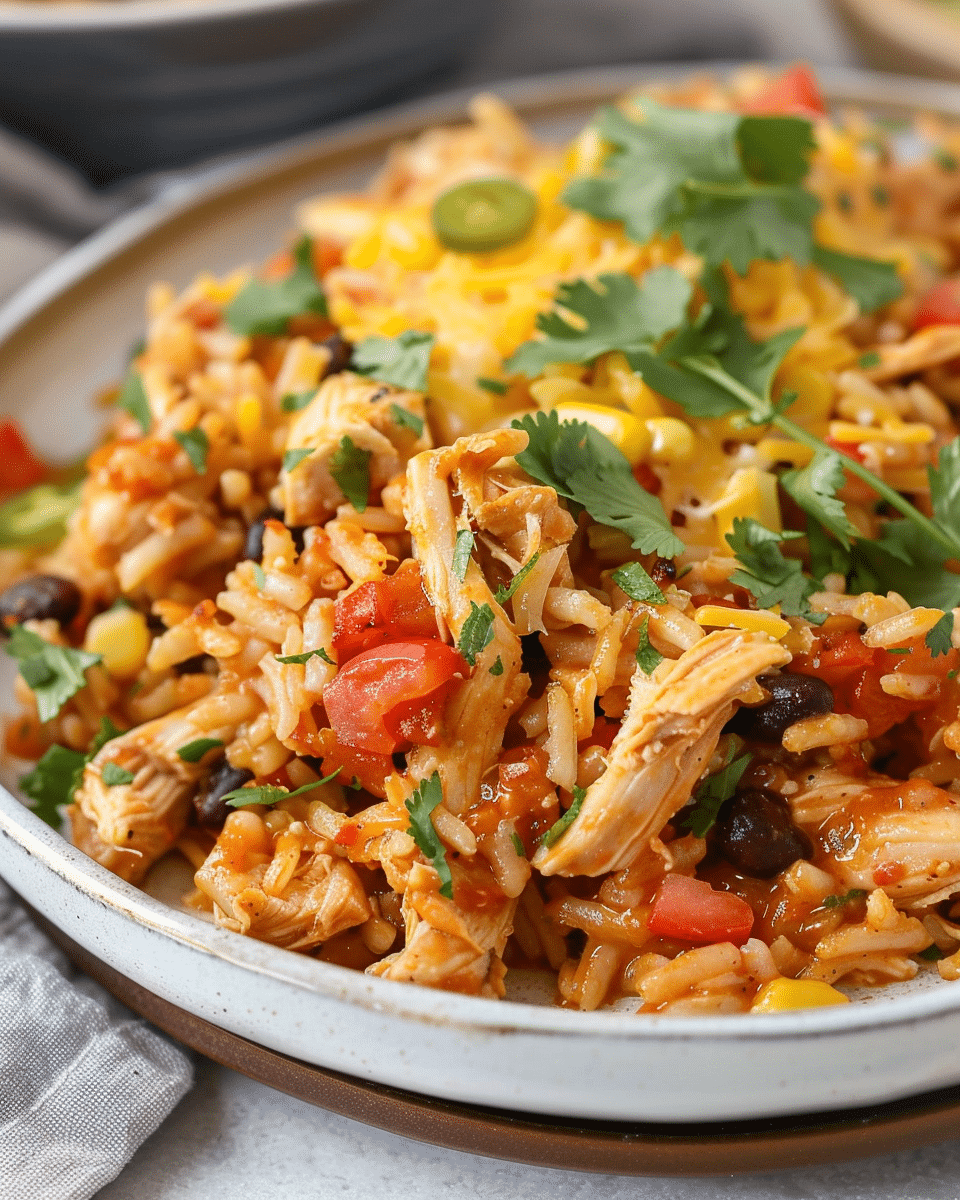 Use chicken thighs for juicier results; breasts for a leaner option.To prevent sticking, keep heat low and avoid stirring too often while simmering.Brown rice can be used but will need longer cook time and more liquid.Fire-roasted tomatoes add extra depth of flavor.Top with shredded cheese or avocado slices for added richness.