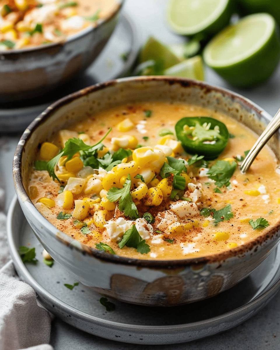 Mexican Street Corn Soup is a creamy, comforting soup inspired by elote, featuring charred corn, chili spices, tangy cheese, and lime in a rich, flavorful broth—perfect for cool evenings or casual gatherings.