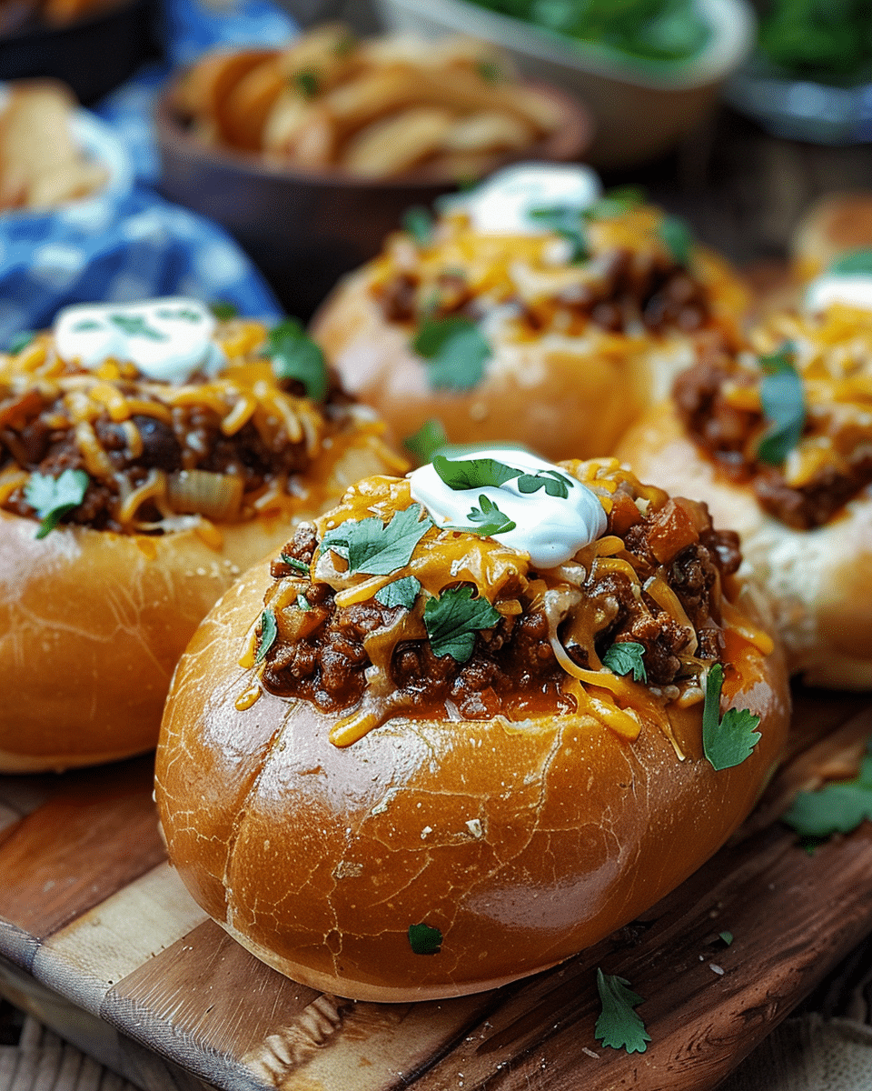 - Warm the chili and fill each bread bowl with a generous spoonful.