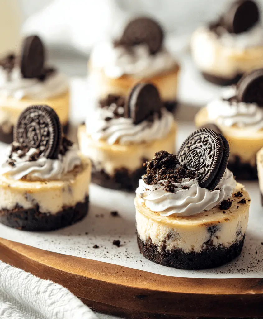 Mini Oreo Cheesecakes are rich, creamy individual cheesecakes with a crunchy Oreo crust and smooth filling — perfect for parties, dessert trays, or any time you want a sweet little treat.